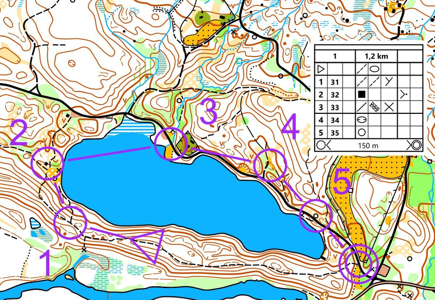 Orientavimosi trasos pradžia pažymėta trikampiu, o finišas - dvigubu apskritimu. Tarp kontrolinių punktų nubrėžtos linijos, kad būtų lengviau matyti, kokia tvarka juos reikia rasti. Atkreipkite dėmesį, kad kiekvienas kontrolinis punktas turi numerį. Pradedate nuo starto, randate 1 kontrolinį punktą, tada 2 kontrolinį punktą, 3 kontrolinį punktą, 4 kontrolinį punktą, 5 kontrolinį punktą ir galiausiai pasiekiate finišą.